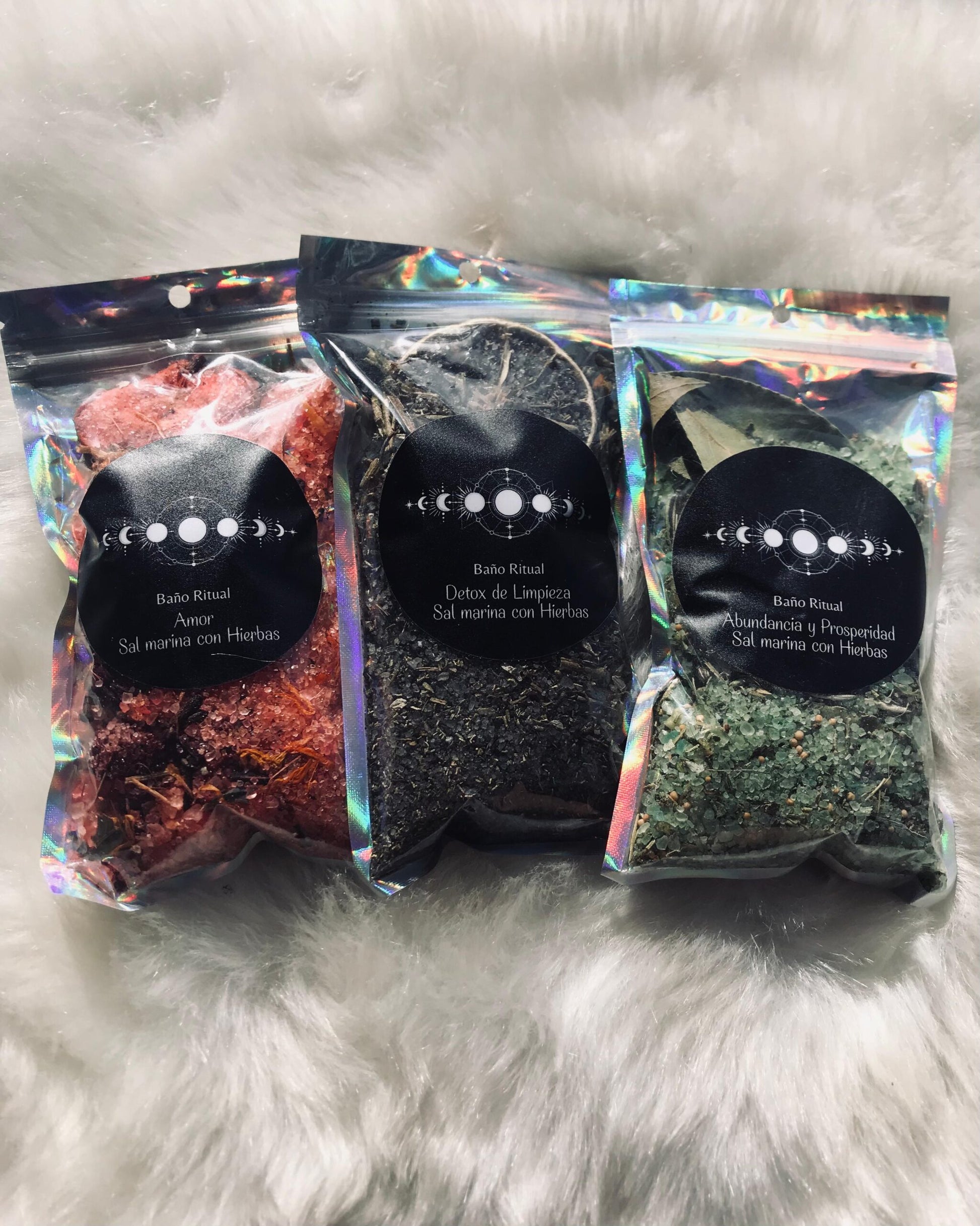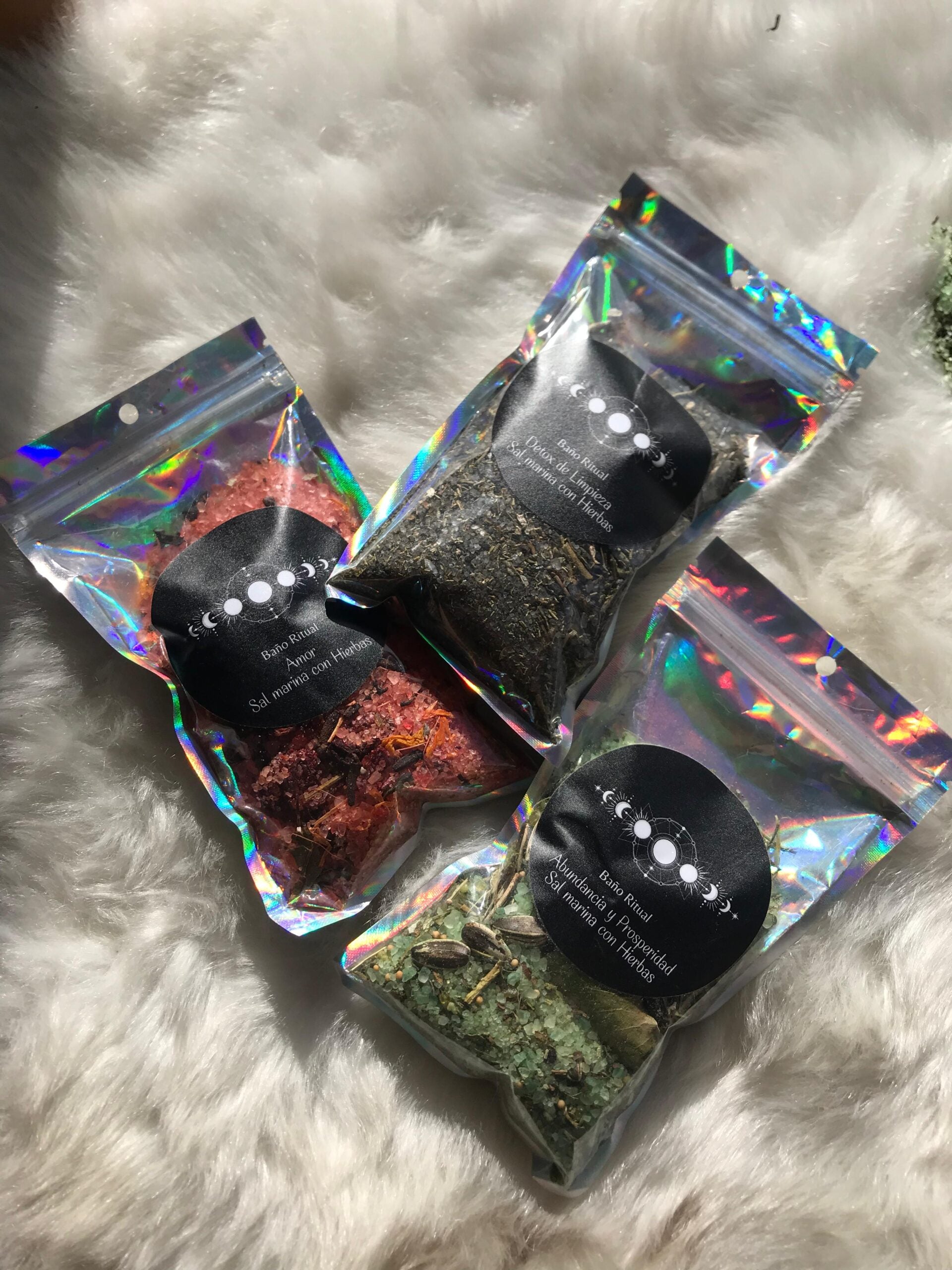 Baños a base de sal marina para la abundancia, de limpia y de llamamiento al amor. Te bañas con ellos dos o tres veces máximo y NO TE ENJUAGAS, importante que la sal quede impregnada en tu cuerpo.