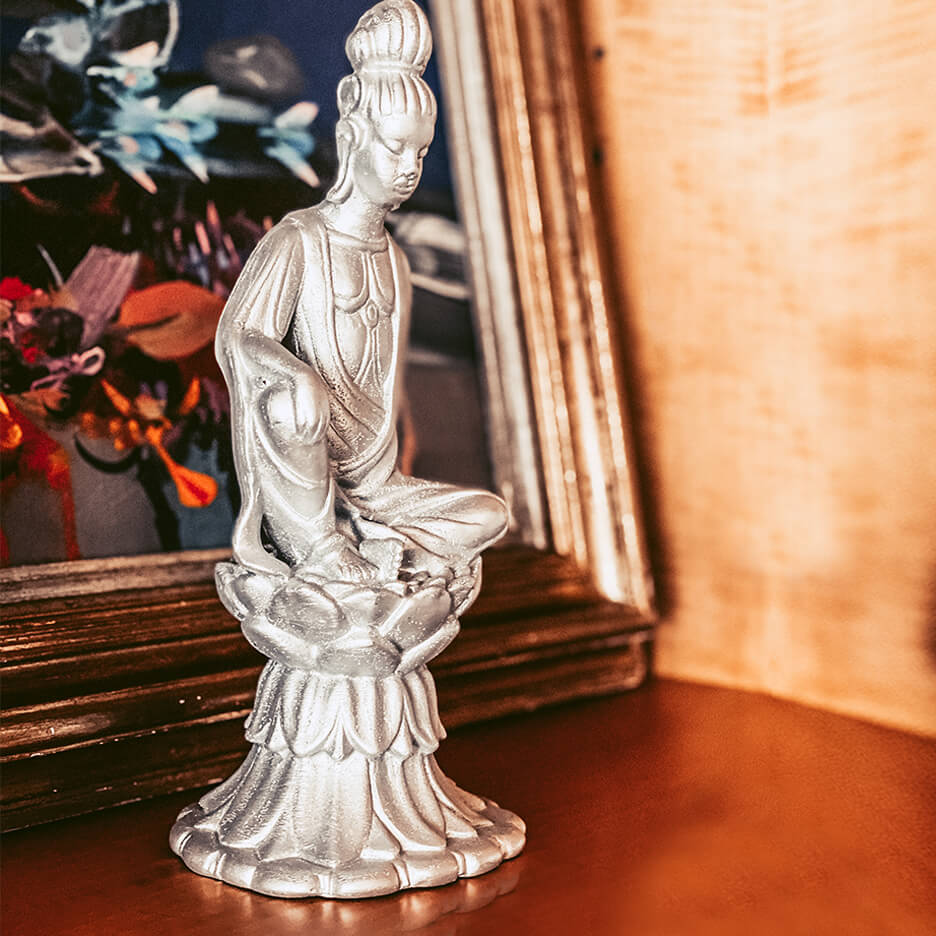 Diosa china de la piedad, la compasión y la protección, física y espiritualmente bella, su nombre significa “la que escucha las plegarias”.“Amada Kuan Yin, por favor, escucha las plegarias que hay en mi corazón. Por favor, descubre y comprende cuáles son mis verdaderas necesidades. Pido tu intervención en las áreas de mi vida que están provocando dolor. Por favor, acude en mi ayuda y asistencia, guiándome para que pueda ver mí situación bajo una nueva luz de amor y compasión. Por favor, ayúdame a ser como tú y a vivir serenamente y con propósito.”