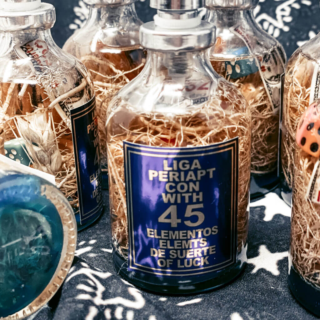 Esta loción contiene una mezcla de elementos y esencias de buena suerte, objetos cabalísticos y mitológicos, talismanes contras y amuletos del esoterismo tradicional, vegetales y frutos sugestivos, símbolos milenarios, los trece colores representativos de las fuerzas positivas. Usándola con fe lograras el triunfo y el éxito en el amor, el dinero, los negocios, empleo y salud. También cuando la usas con fe, te protege de envidias, malos vicios, hechizos, taques energéticos, ladrones y de las malas vibras.