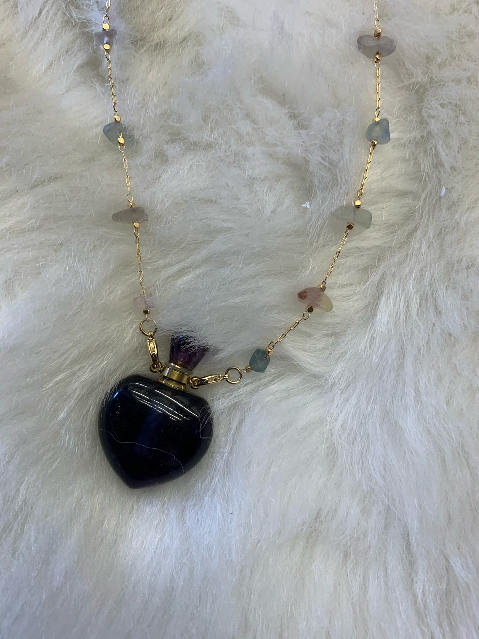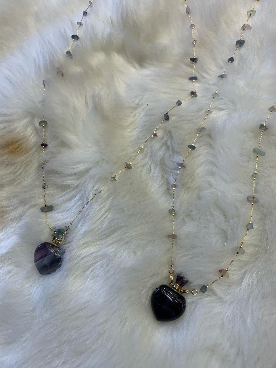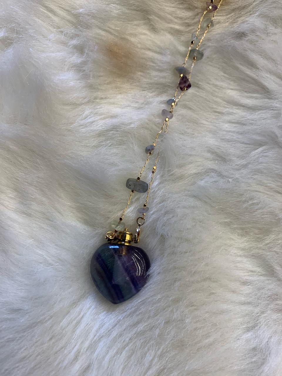 Este hermoso collar perfumero combina la magia de la fluorita, un cuarzo conocido por su energía protectora y equilibrante, con la funcionalidad de llevar contigo tus esencias favoritas. Su diseño en forma de corazón no solo lo convierte en una joya especial, sino en una herramienta poderosa para portar aceites esenciales, esencias de protección o fragancias personales.