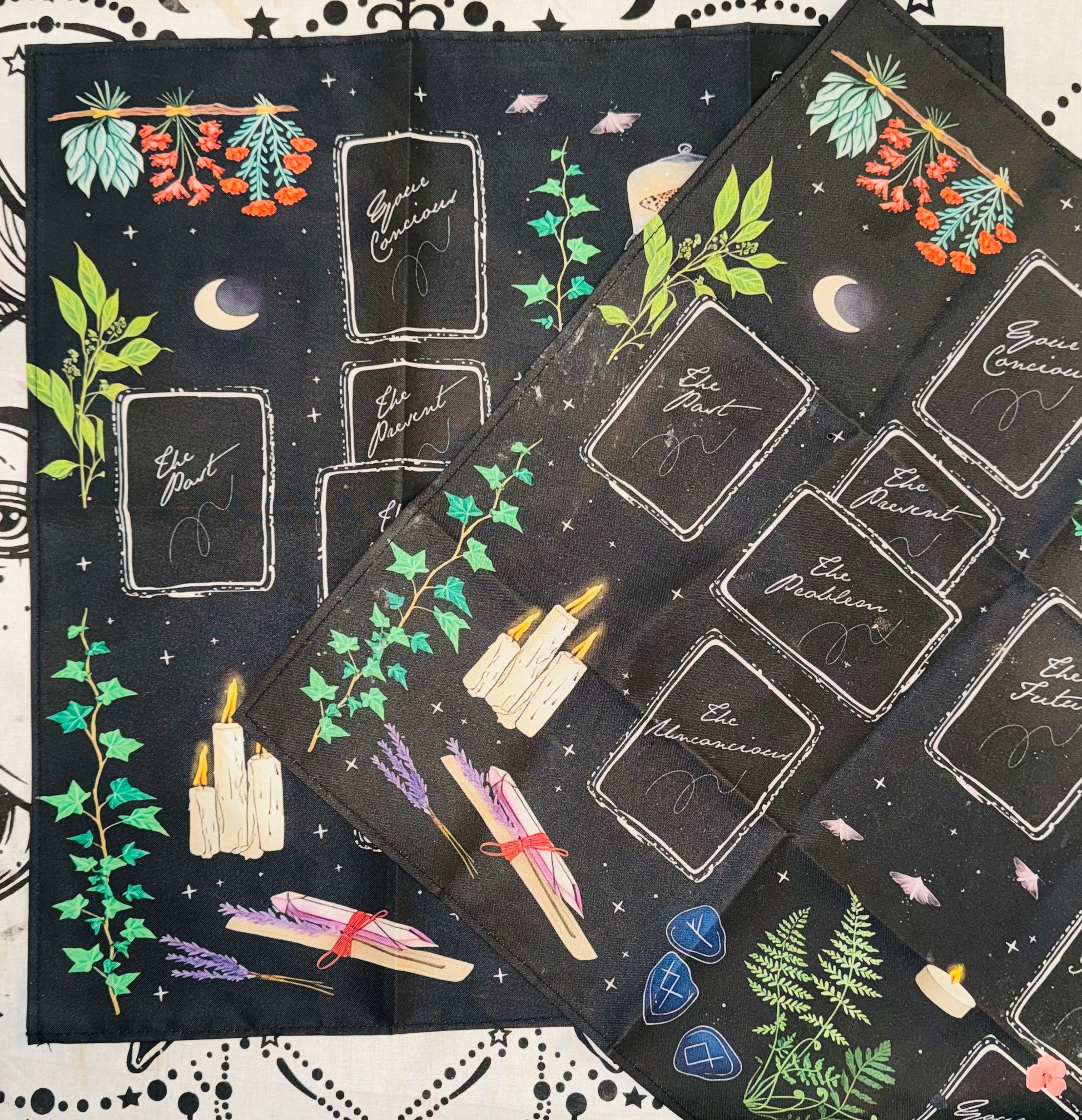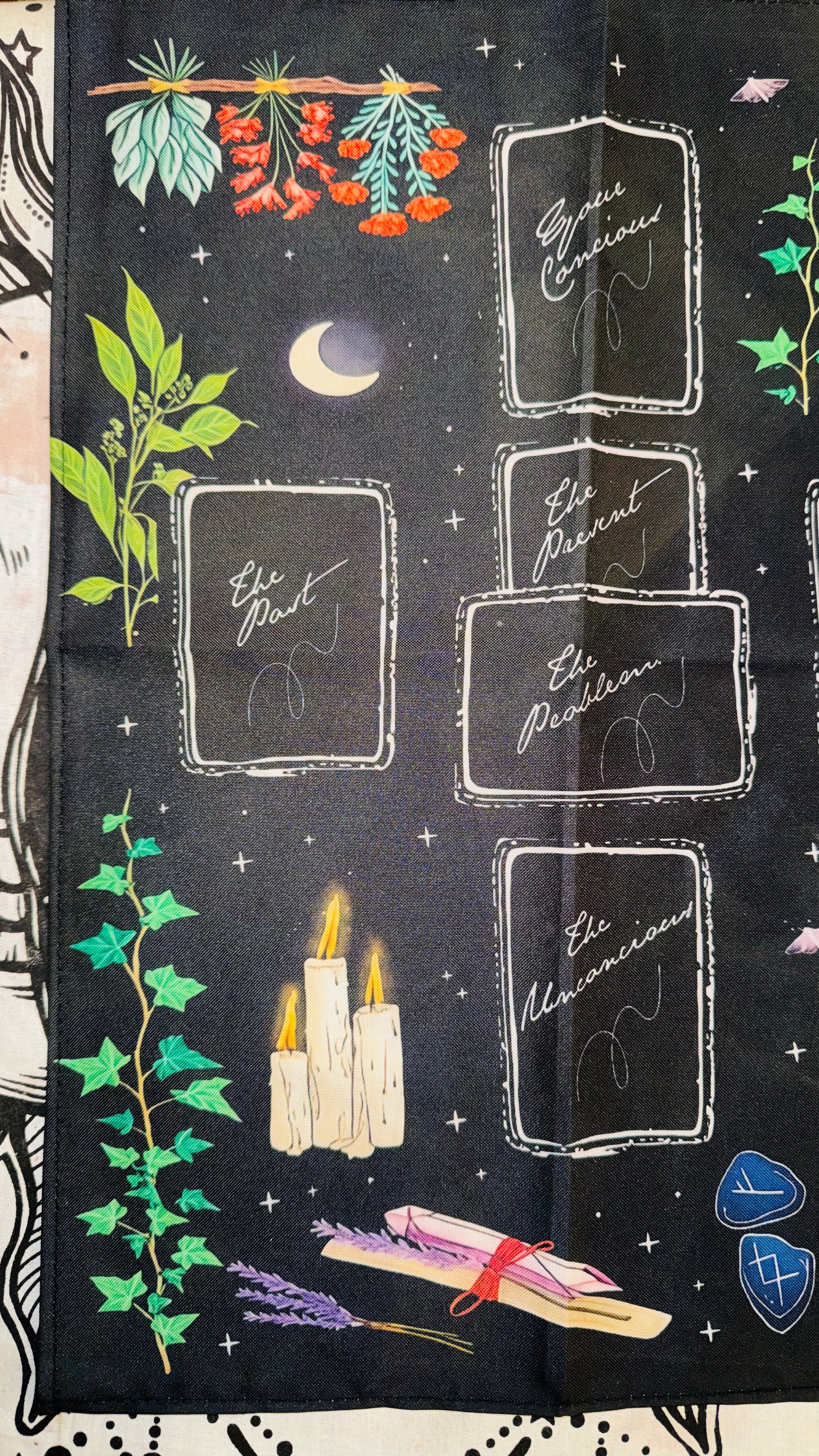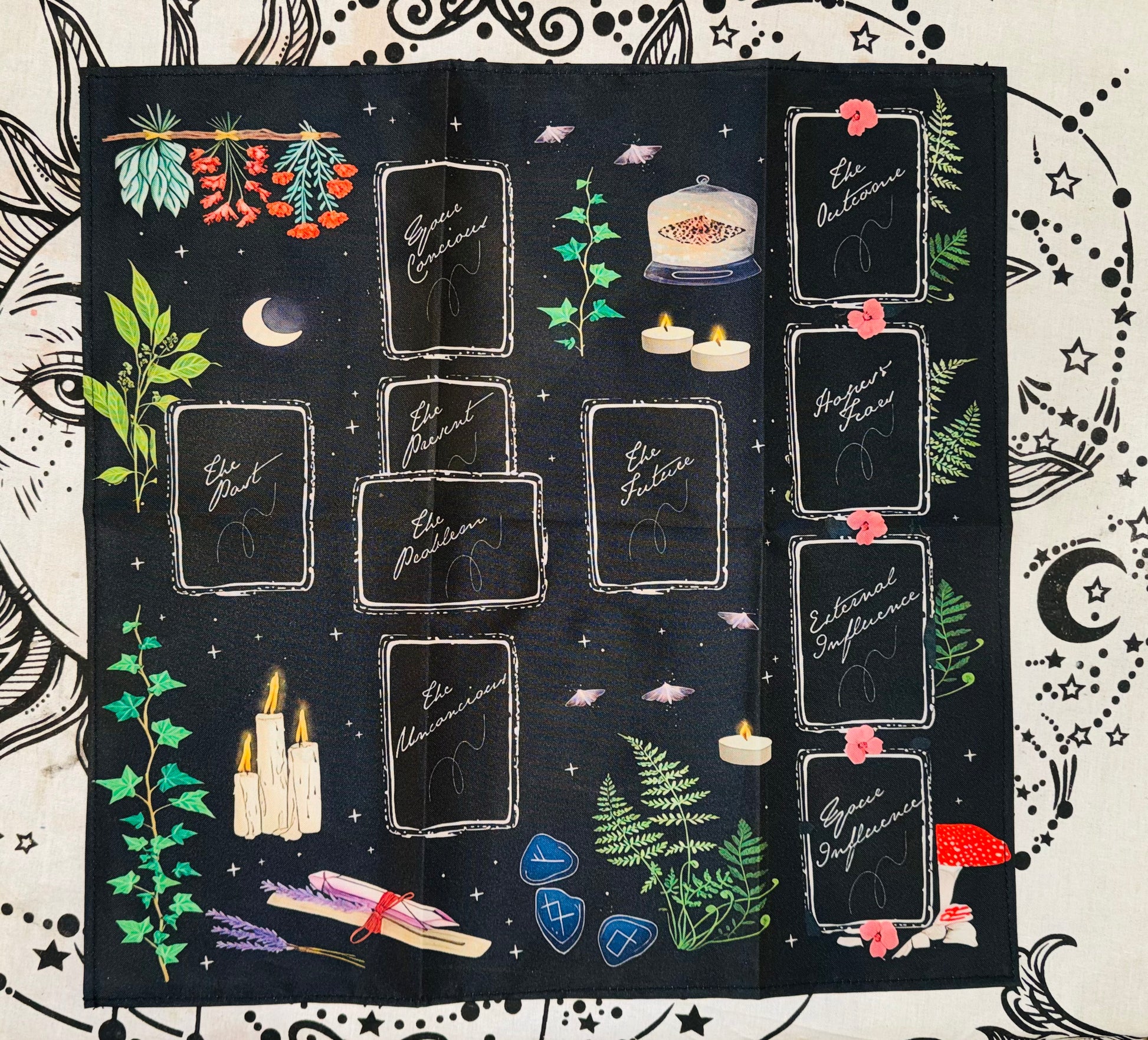 Este tapete místico te acompaña a interpretar el pasado, presente y futuro, integrando también las energías del inconsciente, las influencias externas y los deseos del corazón.