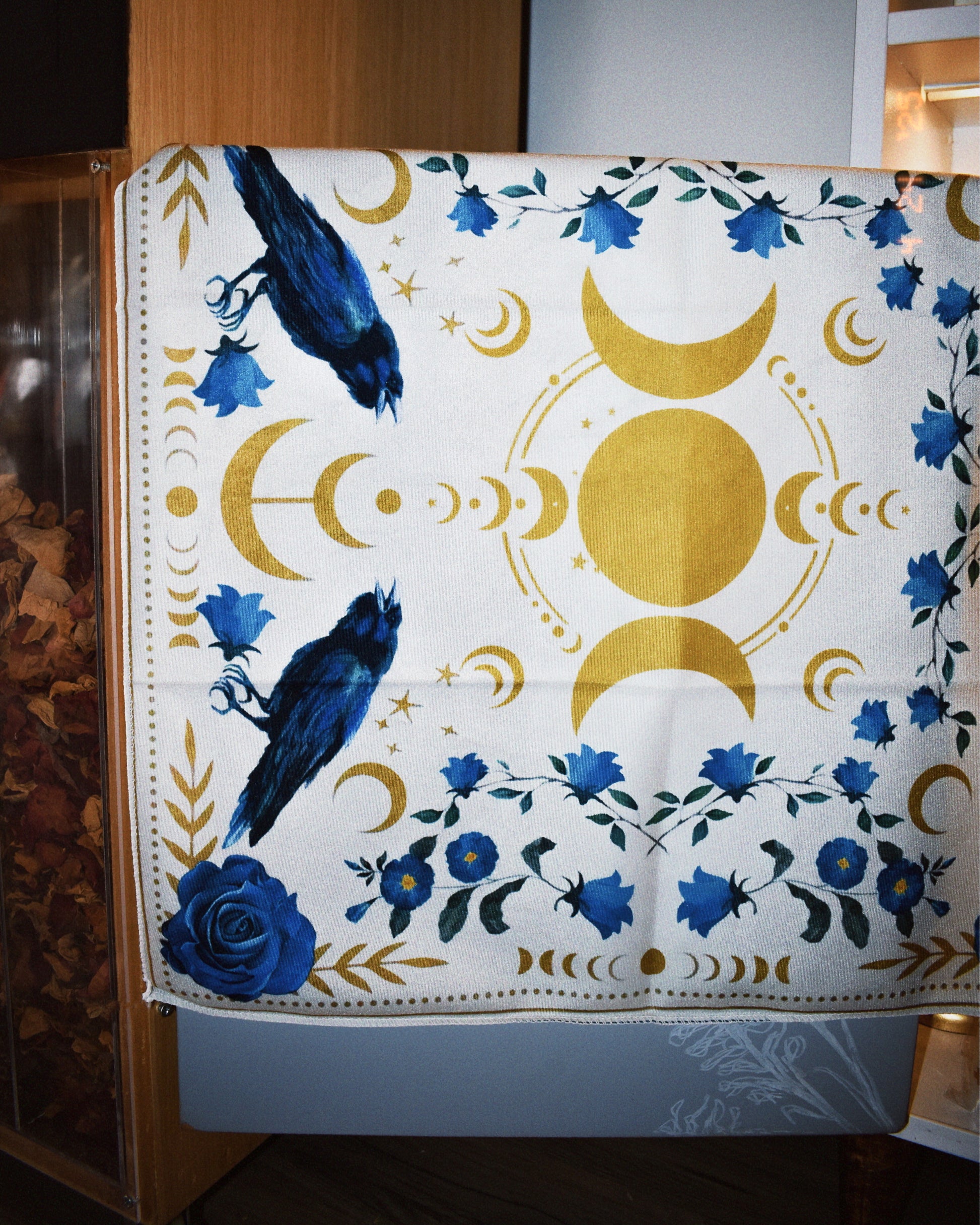 Este tapete místico está diseñado para acompañar tus rituales, lecturas de tarot y momentos de conexión espiritual. Ilustrado con cuervos, flores azules y fases lunares doradas, simboliza sabiduría, transformación y guía intuitiva.